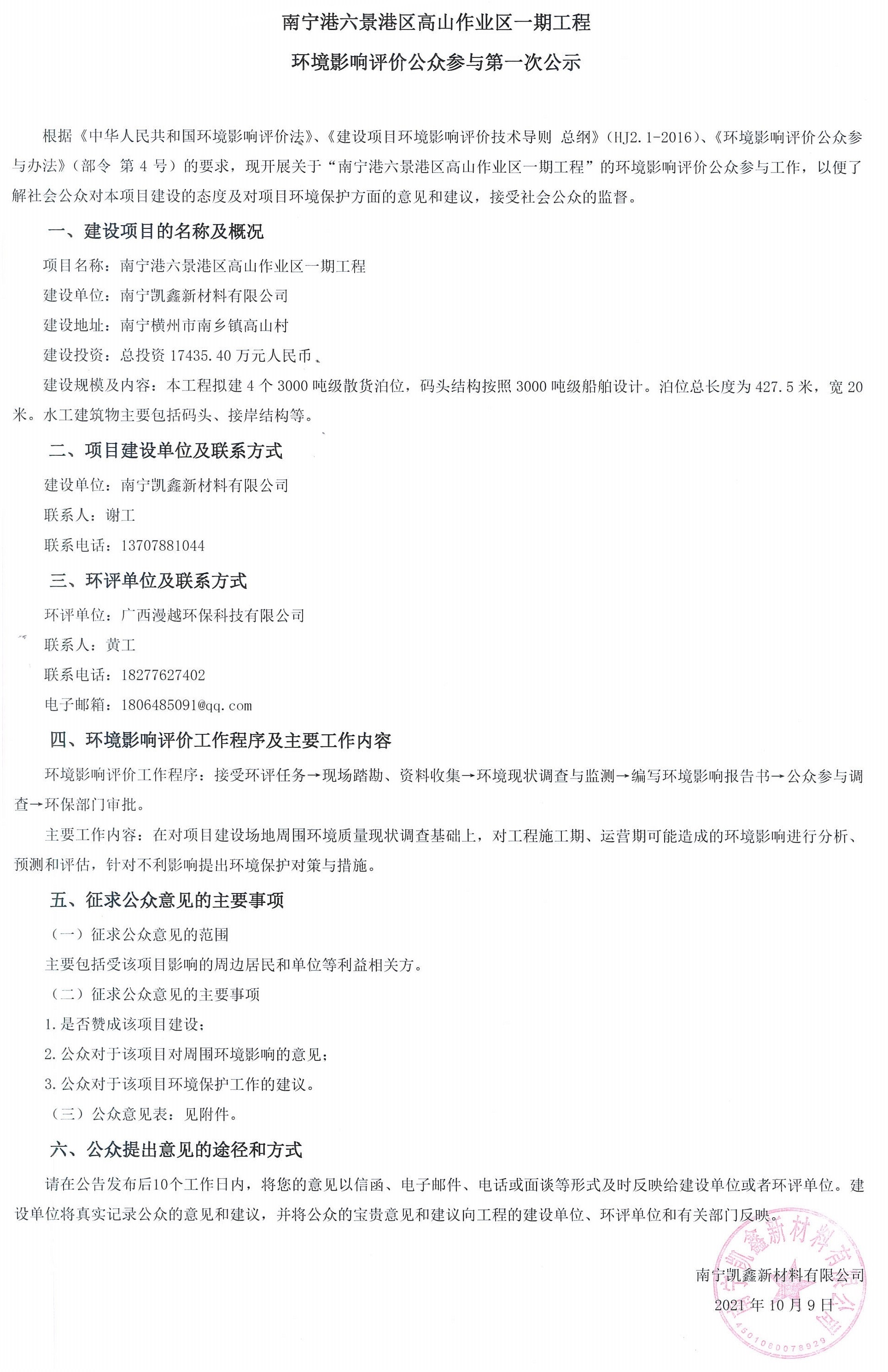 南宁港六景港区高山作业区一期工程环境影响评价公众参与第一次公示