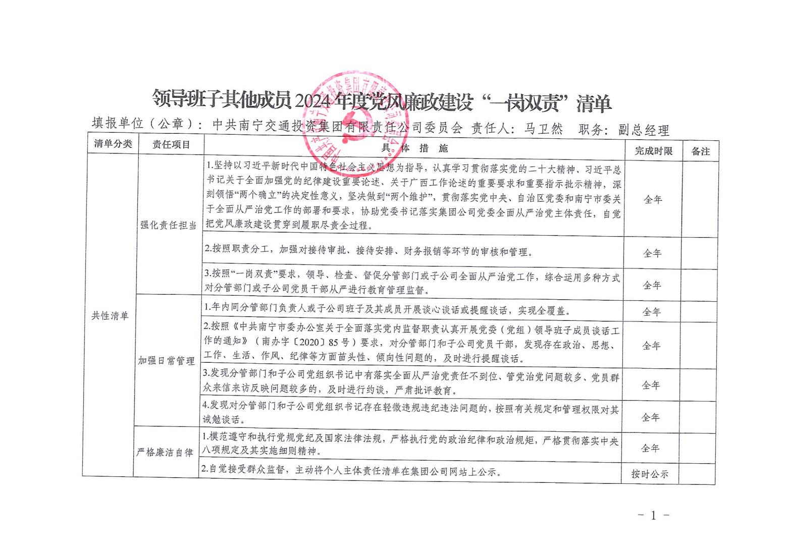 领导班子其他成员2024年度党风廉政建设“一岗双责”清单(六)