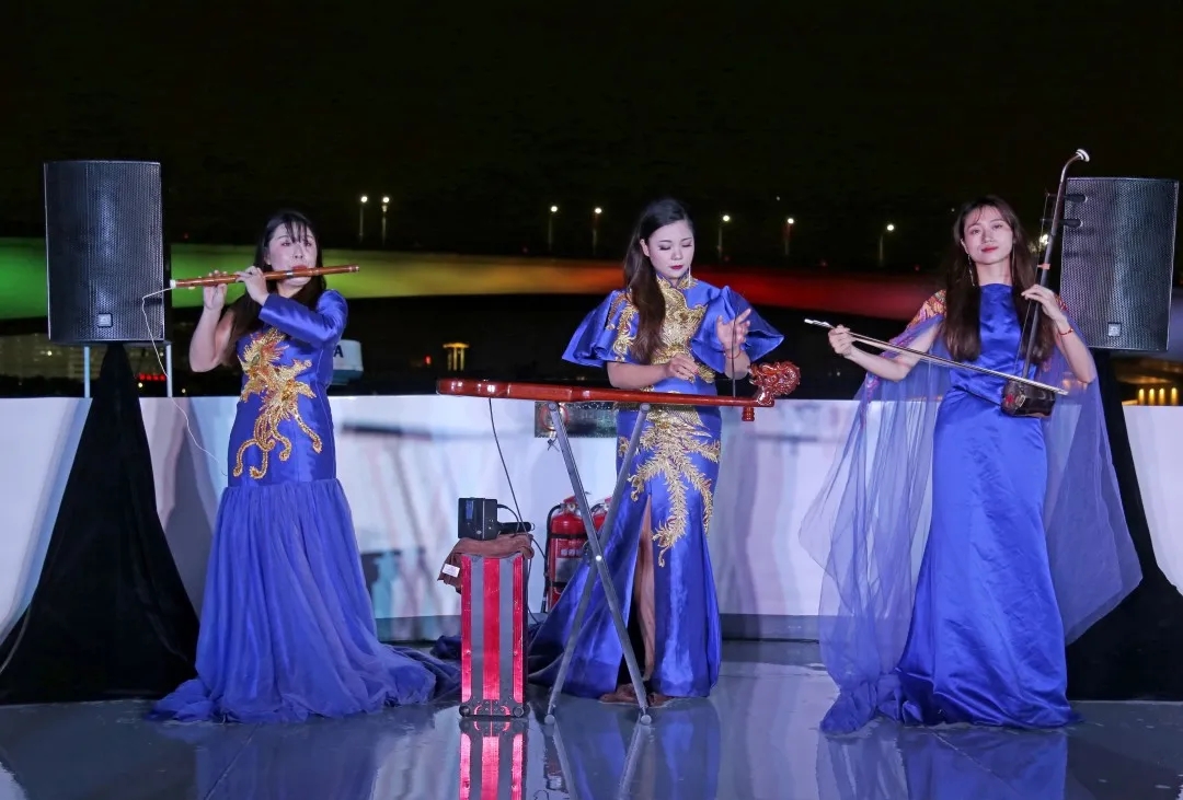 微风拂面,夜景怡人,满载游客的3艘邕江游船来回穿梭在邕江之上,沿江两岸灯光绚丽多彩,跨江大桥恢弘大气,民乐表演风情十足,乘船游客纷纷拿出手机、相机合影留念。