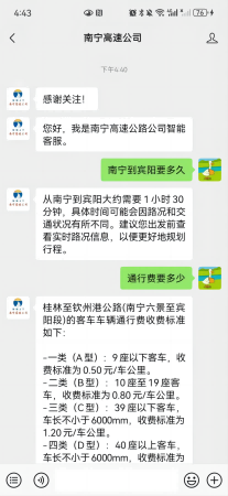 司乘只需关注“南宁高速公司”微信公众号,点击发消息即可轻松开启在线咨询之旅。这种将AI智能客服融入微信公众号的方式,充分考虑了司乘人员的使用习惯,进一步拉近了企业与司乘之间的距离。