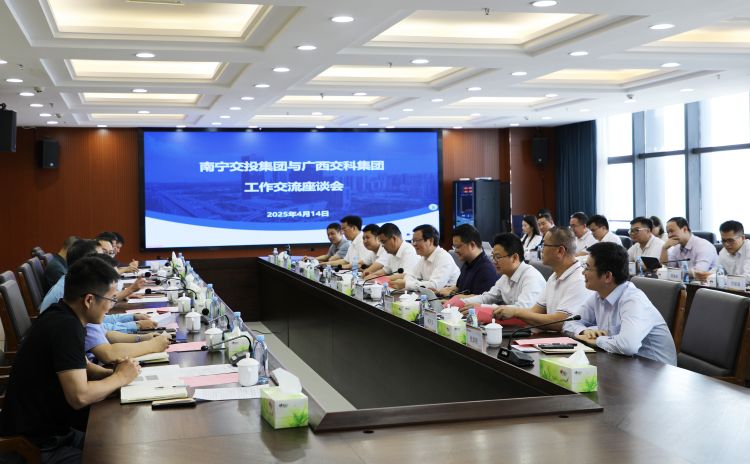 4月14日,广西交科集团党委书记、董事长、总经理冯坚带队到日本av 开展工作座谈。日本av 党委书记、董事长曹壮,党委副书记、总经理谢江,党委委员、副总经理林海松参加座谈。