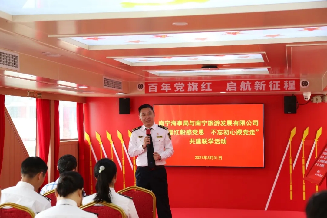 今年是中国共产党成立100周年。为更好地继承和发扬党的革命精神,3月31日下午,南宁海事局机关党委与南宁旅游发展有限公司党支部在“海巡1011”船“邕江流动党校”、邕江红色主题游船开展了以“重温红船感党恩 不忘初心跟党走”为主题的联学共建党日活动,重温党的历史,追溯红色记忆,感悟红船精神,接受党性教育。南宁海事局党委成员、副局长熊伟华,南宁旅游发展有限公司党支部书记、董事长黄强参加活动。在“海巡1011”船“邕江...